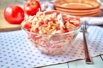 - Заправить майонезом, тщательно перемешать и сразу подавать.