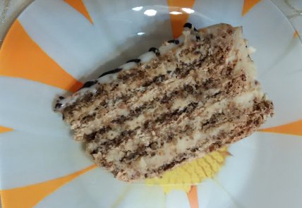 Размягченное сливочное масло взбейте со сгущенным молоком и постепенно подмешивайте заварной крем. Коржи смажьте кремом и сложите один на один. Вынесите на 2 часа на холод.