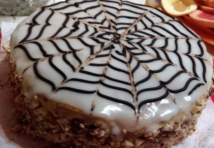 Для паутинки растопите 50 г черного шоколада с 1 ст. л. сливок. Выложите в кондитерский мешок и нанесите круги по спирали, начиная из центра.