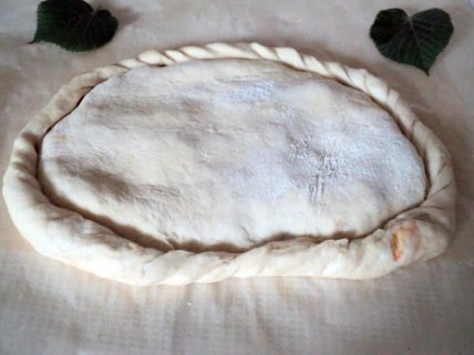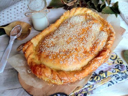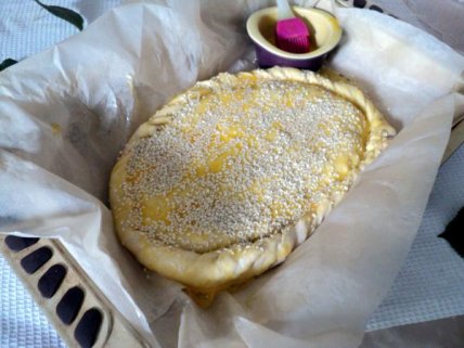 10. Переносим полуфабрикат на противень, устеленный пергаментом, смазываем пирог яичным желтком, по желанию посыпаем семечками кунжута или льна. При температуре 180 градусов запекаем пирог с капустой 25-30 минут.