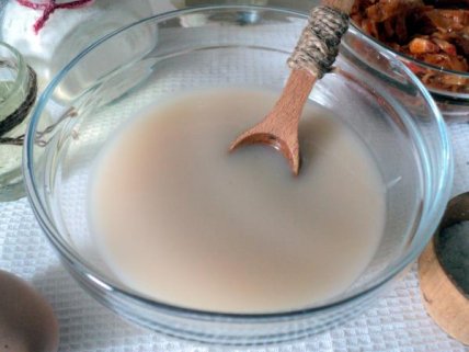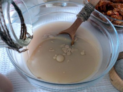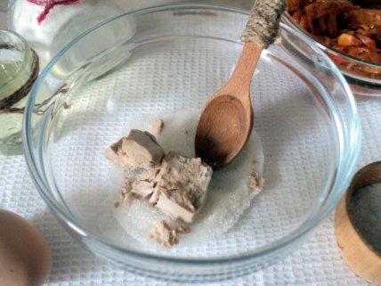 1. В глубокую чистую стеклянную емкость кладем дрожжи и сахар.