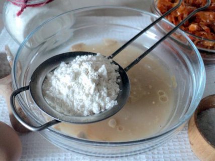 4. Теперь понемногу вводим пшеничную муку, перемешиваем все ложкой, в дальнейшем дорабатываем тесто руками.
