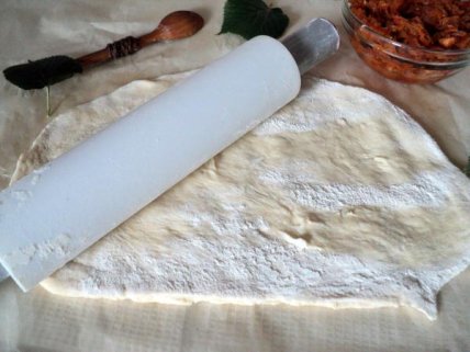 6. Раскатываем наше тесто в небольшой пласт, предварительно разделив колобок на две части, одну больше, другую меньше, большую часть используем для основы.