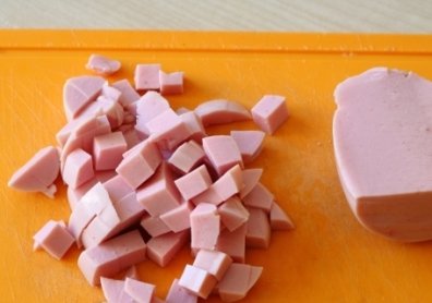 Также нарежьте и колбасу.