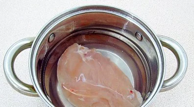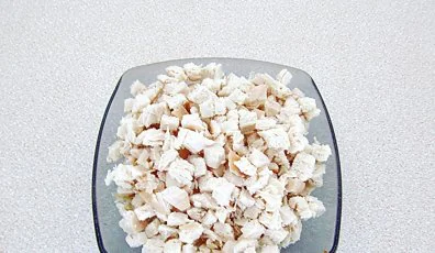 Отварить или обжарить куриное филе, остудить и порезать маленькими кубиками.