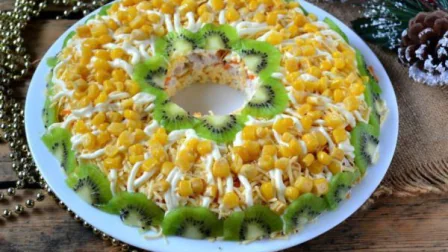 Салат лучше всего подавать охлажденным, слегка оформленным ломтиками киви сверху для яркого акцента. Можно выложить его пластами или в стеклянных порционных креманках для праздничной подачи. Он хорошо сочетается с тостами, лёгкими закусками, фруктовыми соусами или лимонным соусом на основе йогурта. Перед подачей салата можно украсить зеленью или измельченными орехами для текстурного контраста.