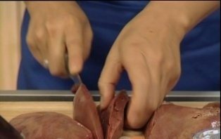 Баранью печень промойте и нарежьте на одинаковые, тонкие ломтики.