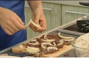 Каждый ломтик печени посолите и поперчите, сверху выложите нарезанный полукольцами лук.