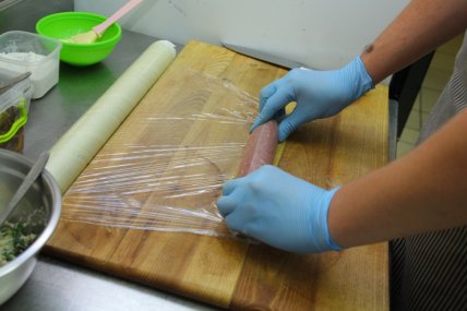 Заверните в рулет и перевяжите ниткой.