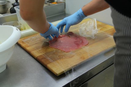 Нарежьте телятину слоями.Отбейте с двух сторон телятину, посолите, поперчите.