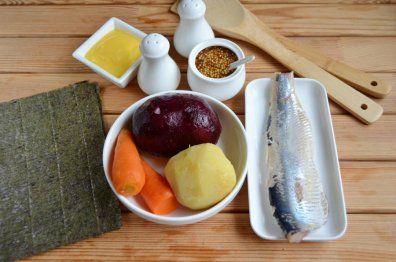 Подготовьте продукты, отварите заранее свеклу и картофель, морковь. Можно добавить немного зеленого или белого лука к овощам в процессе сборки.