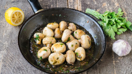 Разогрейте оливковое масло в большой сковороде и добавьте грибы. Обжарьте 3 минуты на среднем огне, помешивая.