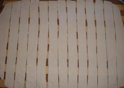 3. Тесто еще раз перешайте. На столе, присыпанным мукой, раскатайте, толщиной около 1 мм и нарежьте полоски, шириной около 3 см.