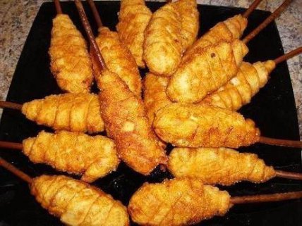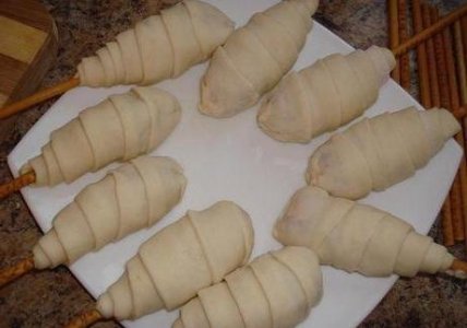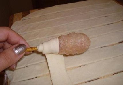 5. Полоской теста обкрутите нашу котлетку, начиная с основания соломки, дойдя до конца, защепите край.