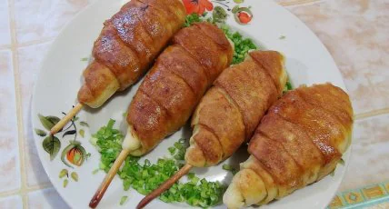 5. Полоской теста обкрутите нашу котлетку, начиная с основания соломки, дойдя до конца, защепите край.