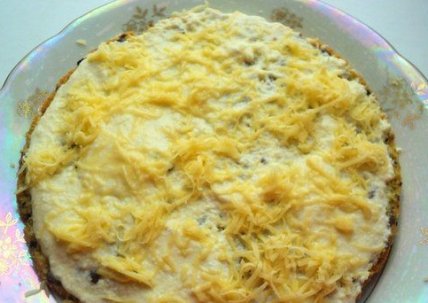 Нагревайте до расплавления сыра. Сборка торта: пласт бисквита уложите на блюдо, смажьте 1/3 горячего сырного крема, посыпьте сверху сыром.