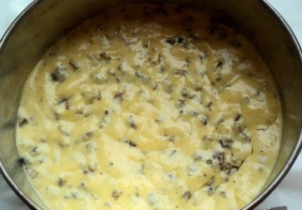 Снимите яичную смесь с водяной бани и аккуратно добавьте смесь муки с разрыхлителем, перемешайте. Добавьте жареные грибы.