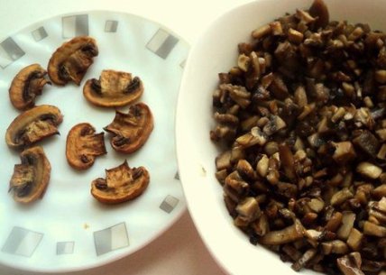 Шампиньоны мелко нарежьте и поджарьте до золотистого цвета. Выложите грибы в тарелку и охладите.