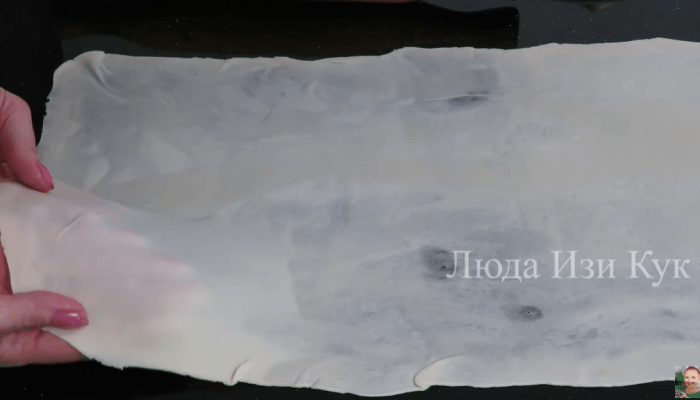 Когда второй пласт теста будет готов, выкладываем на него рулет и также сворачиваем. То же самое повторяем с третьим куском теста.