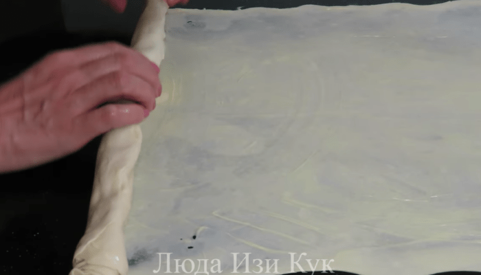 Раскатанное тесто смазываем 1/3 частью размягченного сливочного масла. После этого сворачиваем тесто в плотный рулет. Накрываем рулет пищевой пленкой и раскатываем следующий пласт теста и также смазываем его маслом.