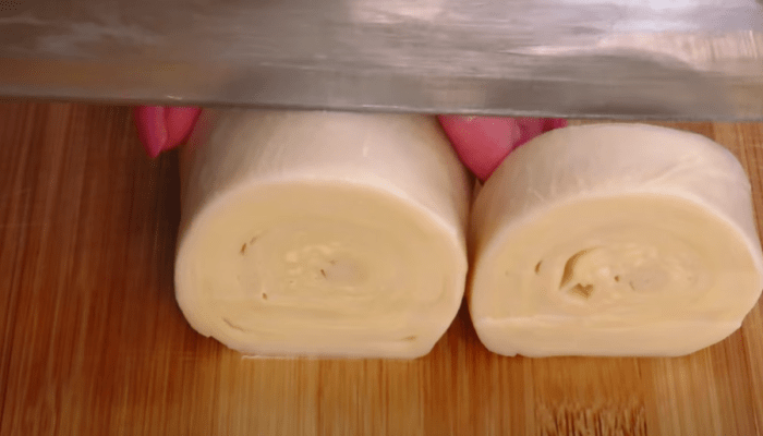 Тесто нарезаем на кусочки толщиной 1-1,5 сантиметра.