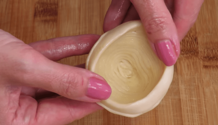 Формируем пирожное. Пальцами надавливаем в центр кусочка и формируем конус, как бы растягивая тесто, раскрывая все его слои. Заполняем полученный конус кремом и немного закрываем.