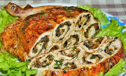 Курица "По-царски", фаршированная блинами (видео-рецепт)