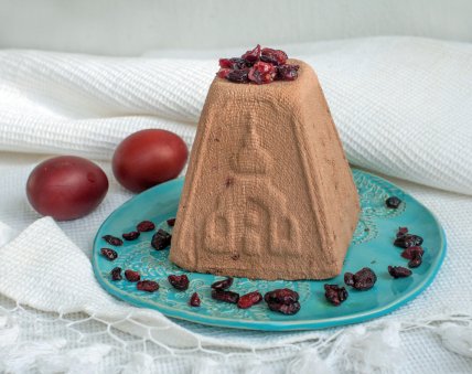 Перед подачей переверните пасху на порционное блюдо и уберите марлю. Украсьте каждую пасху вишней в собственном соку, обильно поливая при этом вишневым соусом. Также можно украсить пасху и сушенными ягодами.