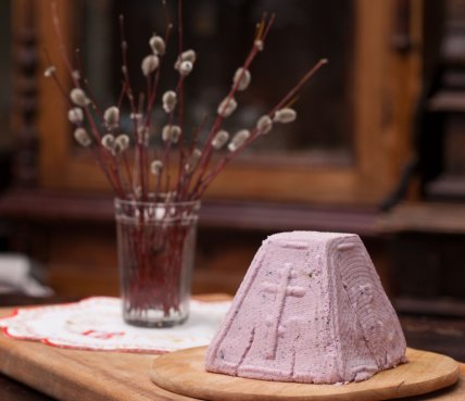 Слегка розоватый цвет этой творожной пасхе придает варенье из малины или вишни. Приготовленная в таком необычном исполнении, эта пасха станет центральным блюдом праздничного стола.