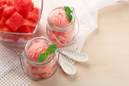 Мякоть арбуза без косточек пюрировать в блендере с соком лимона.Приготовить сироп и остудить.Арбузное пюре хорошо перемешать с готовым сиропом.Полученную массу вылить в форму, еще раз перемешать и поставить в морозилку.В процессе заморозки еще несколько раз перемешать сорбет.Читай также: 7 потрясающих блюд из арбуза