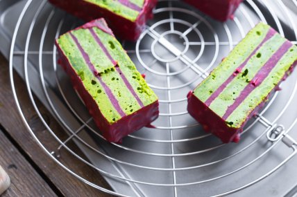 Удивительное пирожное с тремя слоями мягкого фисташкового бисквита и малиновым конфи. Если правильно следовать рецептуре, то на приготовление десерта уйдет не более часа.