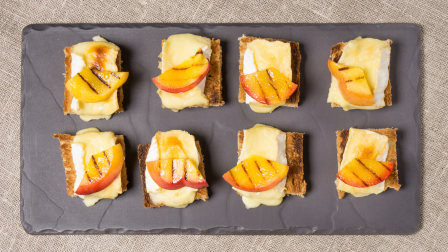 Намажьте гренки маслом, разместите сверху большую порцию нектаринов, полейте сверху жидким медом и подавайте к столу.
