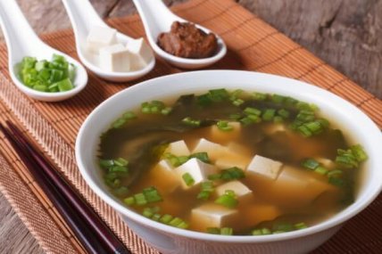 Трудно представить себе японскую кухню без мисо-супа с кубиками сыра тофу и зеленью. Паста мисо, которая дала название супу, представляет собой густую массу, чаще всего из сои, иногда встречается из пшеницы