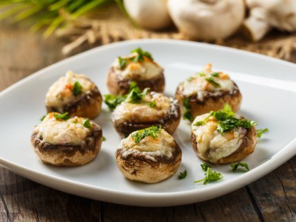 Очень быстрая и легкая в приготовлении вегетарианская закуска из грибов фаршированных твердым сыром с чесноком..