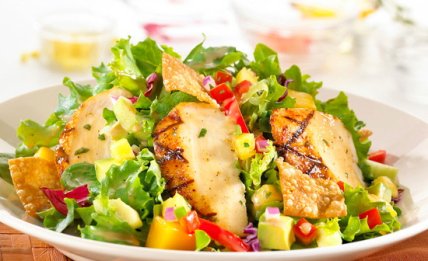 Выкладываем горячие куриные кусочки на большое блюдо, а рядом помещаем готовый салат и подаем к столу. Приятного аппетита!