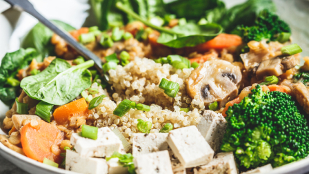 Нарежьте тофу кубиками и обжарьте на сковороде на оливковом масле до румяных бочков.Разделите брокколи и цветную капусту и бланшируйте в кипящей воде.Киноа залейте водой в соотношении 1 к 1 и готовьте около 15 минут.Затем соедините киноа с брокколи и цветной капустой.Добавьте тофу, вяленую клюкву.Присолите и поперчите по вкусу.Заправьте оливковым маслом и хорошо перемешайте.Как подавать