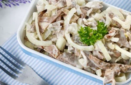 Совет: вместо сердца можно использовать также печень, язык или смесь субпродуктов, главное - чтобы всех остальных ингредиентов было не меньше 3-й части от субпродуктов (можно и больше). И еще, этот салат любит майонез, так что его не жалейте.
