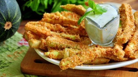 Кабачки промийте, обсушіть, зріжте плодоніжки та кінчики. Далі розріжте кабачки навпіл або на три частини, поріжте брусочками.Перекладіть кабачки в миску, додайте сіль, перець за смаком і рослинну олію, перемішайте.Розігрійте духовку до 220 градусів.Окремо в мисці змішайте тертий сир, сухарі, усі спеції.Візьміть ще одну миску та збийте в ній яйце.У миску до кабачків додайте пшеничне борошно, перемішайте та залиште на пару хвилин.Деко для випікання застеліть пекарським папером та змажте олією.Занурюйте бруски кабачків спершу в збите яйце, потім в панірувальні сухарі.Перекладіть кабачки на деко та виікайте в духовці 15-20 хвилин (через хвилин 7-9 діставайте деко, переверніть кабачки та готуйте ще 7-9 хвилин).Як подавати