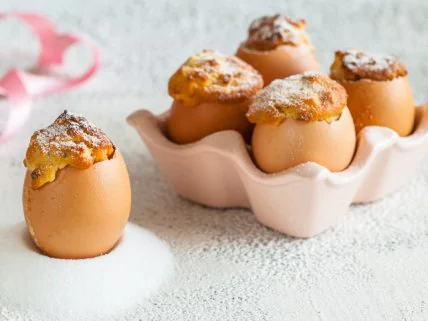 Предлагаем взять себе на заметку еще одну интересную идейку – пасхальные яйца и выпечка – 2 в 1. Собственно речь о кексах, которые пекутся в яичной скорлупе.