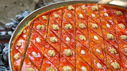 Разведите теплой водой дрожжи, добавьте муку, сметану, яйцо, масло, соль.Замесите тесто, раскатайте его до толщины 0,5 мм.На смазанный маслом противень положите тесто.Сверху посыпьте начинкой из орехов, смешанных с сахаром, и закройте вторым слоем теста.Затем смажьте маслом и снова посыпьте начинкой.Таким же образом сделайте еще несколько слоев.После этого пахлаву разрежьте на ромбы размером 10х4 см.Верхний слой смажьте желтком, смешанным с настоем шафрана.В середину каждого ромба положите половину ореха.Выпекайте при температуре 180–200С 35–40 минут.Затем пахлаву сверху смажьте сиропом или медом и снова поставьте на 5 минут в духовку.Как и с чем подавать