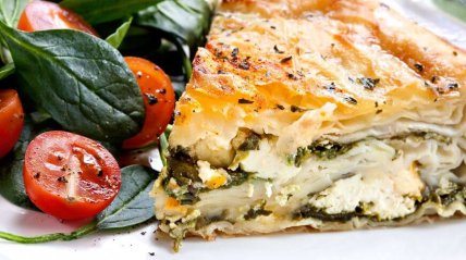 Греческий пирог спанакопита готовится из теста фило, заправленного оливковым маслом и лимоном, а шпинат и брынза красноречиво говорят о том, что пирог – поистине здоровая пища.