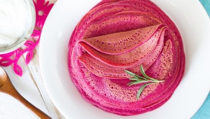 Вам не понадобятся пищевые красители. Придать цвет блинчикам можно с помощью натуральных ингредиентов. Вспомним те времена, когда торты к праздникам готовились, в большей мере, в домашних условиях хозяйками. И чтобы придать цвет заварному крему использовали сок свеклы. Таким образом, получались розовые цветы на торте.