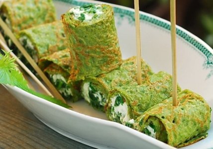 Чтобы приготовить зеленые блинчики, вам понадобиться сок шпината. Промойте листья, обдайте кипятком и измельчите. Еще раз залейте кипятком (20-30 мл), дайте настояться. Полученный настой добавьте в тесто для блинов.