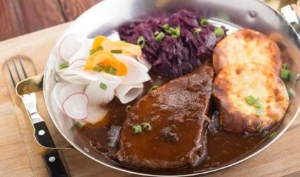 Зауербратен – это блюдо, которое готовится и из говядины, и свинины. Но перед термической обработкой мясо маринуют от1-3 дней до недели в специальном маринаде. К столу подают тонко нарезанными ломтиками с картофельными клёцками или яблоками, нарезанным кубиками.