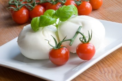 Нежные белые шарики моцареллы итальянцы используют при изготовлении пиццы, салатов, лазаньи, запеканок и пирогов. Классическая комбинация – моцарелла, помидоры и зеленый базилик.