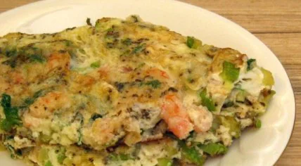 Аккуратно перевернуть и жарить омлет с кабачками и креветками 1-2 минуты с другой стороны. Омлет с кабачками и креветками готов.