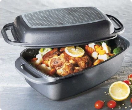 Утятница (гусятница) – это овальная кастрюля, чаще всего выполненная из толстого чугуна и покрытая эмалью. Есть также утятницы (гусятницы) алюминиевые с антипригарным покрытием, керамические, из жаропрочного стекла. Последних 2 вида можно использовать только в духовке, тогда как в металлических гусятницах можно готовить блюда также на плите.