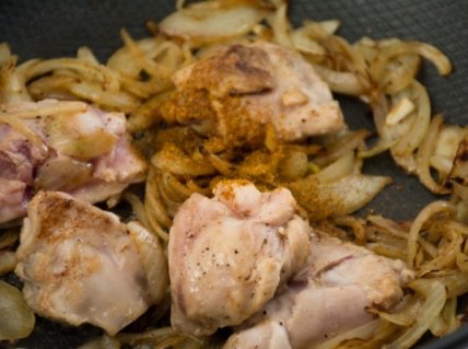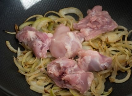 Добавьте на сковороду нарезанную кусками курицу.
