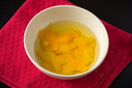 Снимите цедру апельсина овощечисткой и замочите в кипятке.