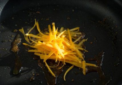 Когда сахар начнет плавится, добавьте цедру и обжарьте со всех сторон.